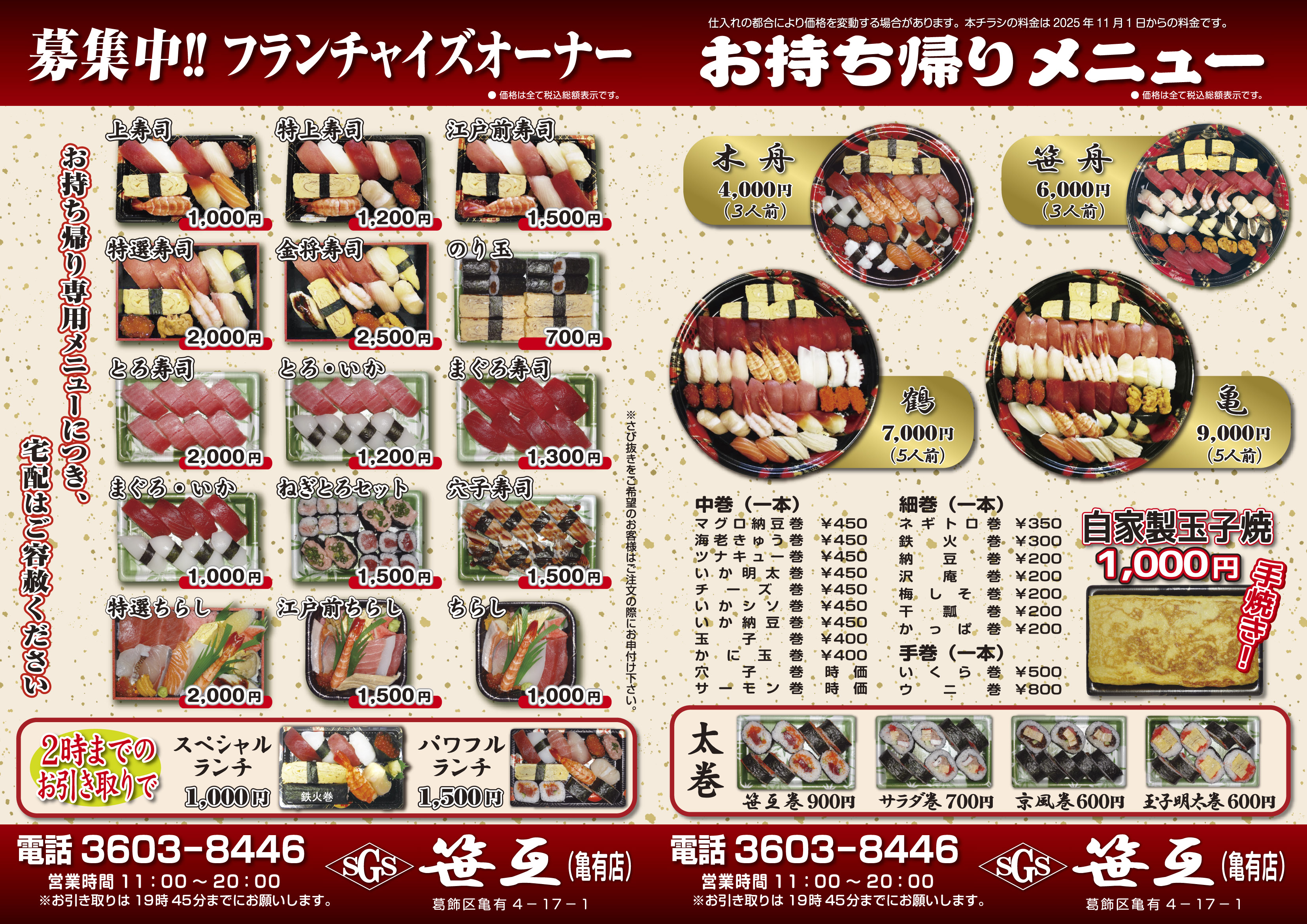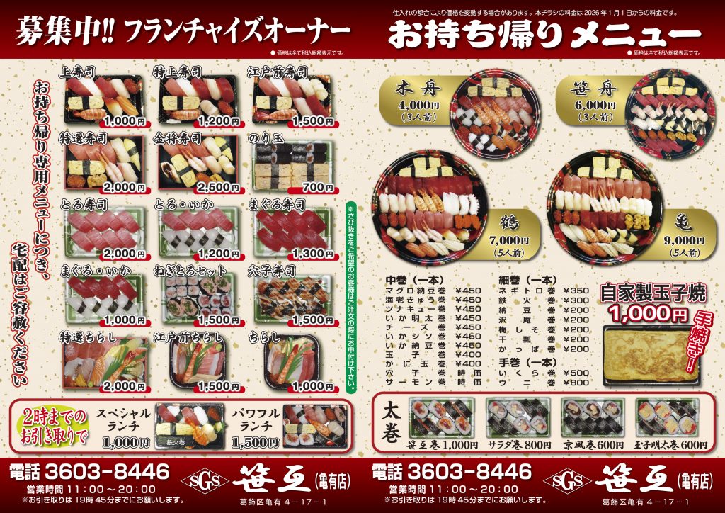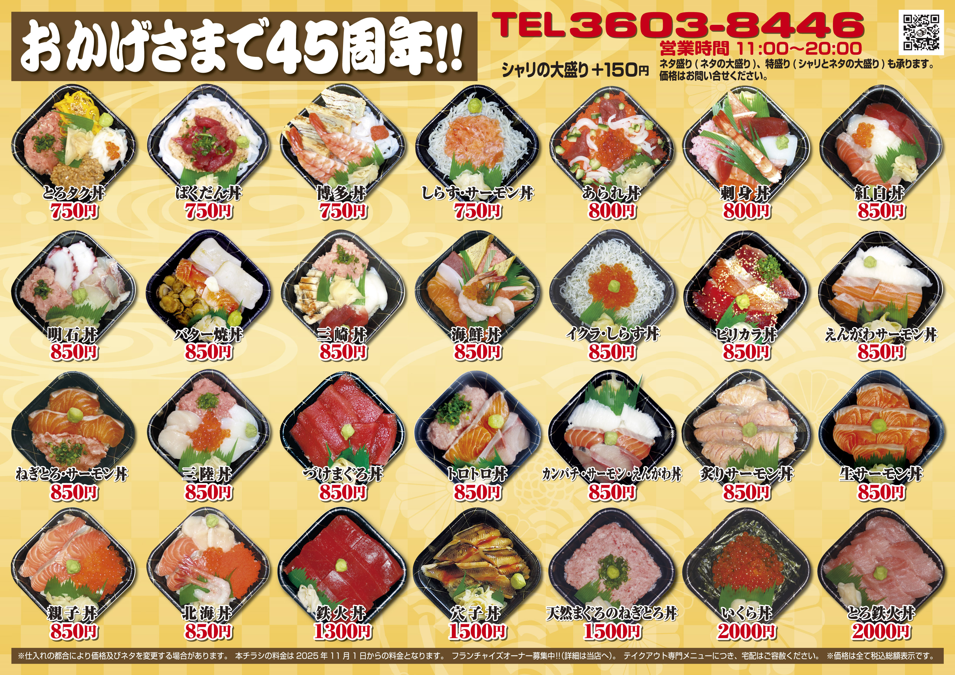 | 取扱品目 | 海鮮丼、握り寿司、巻寿司 |